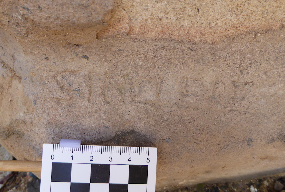 There are a number of VV marks, thought to be dedications to the Virgin Mary. There is a group of small, compass-drawn circles, on one face. Such marks are also thought to be apotropaic, protecting a building from evil spirits and the Devil, and are common finds in churches and secular buildings all over the country. There are also many initials, some enclosed within boxes, and 17th and 18th century dates (including 1711 again). The FontThe original font survives in a very sorry state, its top covered with the molten remains of its lead lining. However, on the plinth there survive some carefully scratched names and initials. (Photo 7) No dates are present but it may well be possible to identify these people through further research.