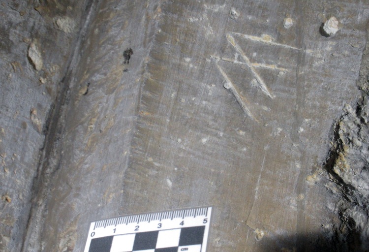 There are 5 of these marks, see figs 6 and 7. One theory is that they are masons’ marks, but the depth of carving, and the presence of seriphs on one set (Fig 4), suggests they are votive marks, connected with the worship of the Virgin Mary. However, they are at a height which makes it hard to see how they could have been made.