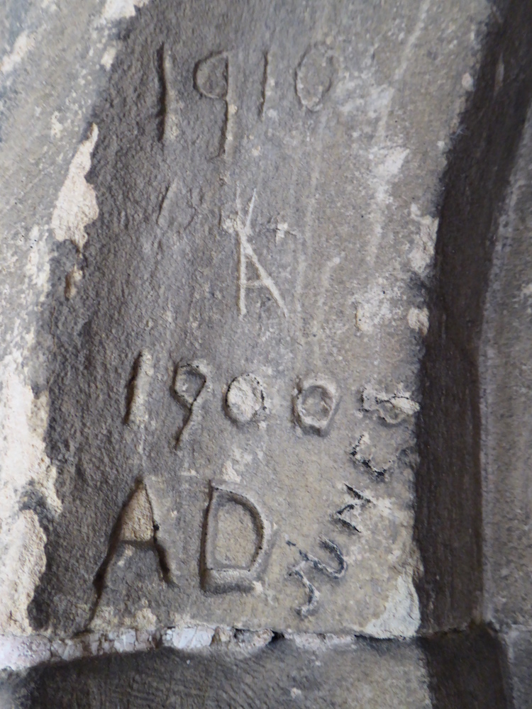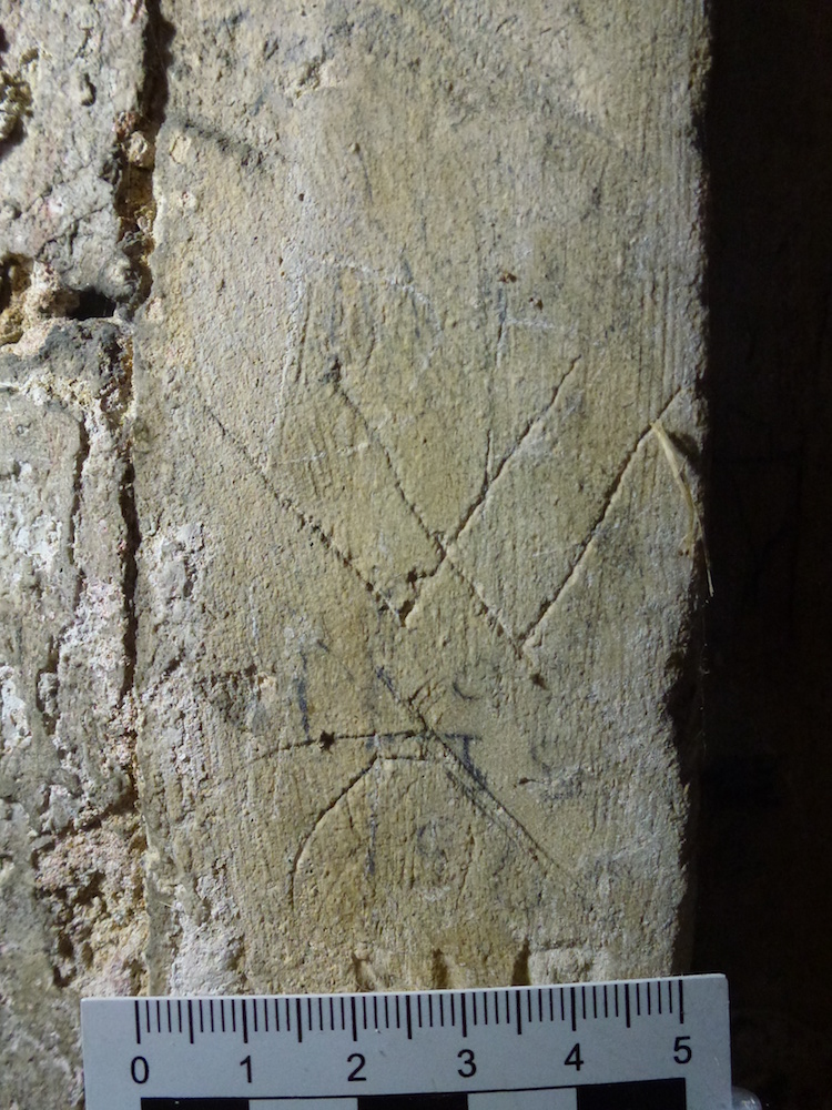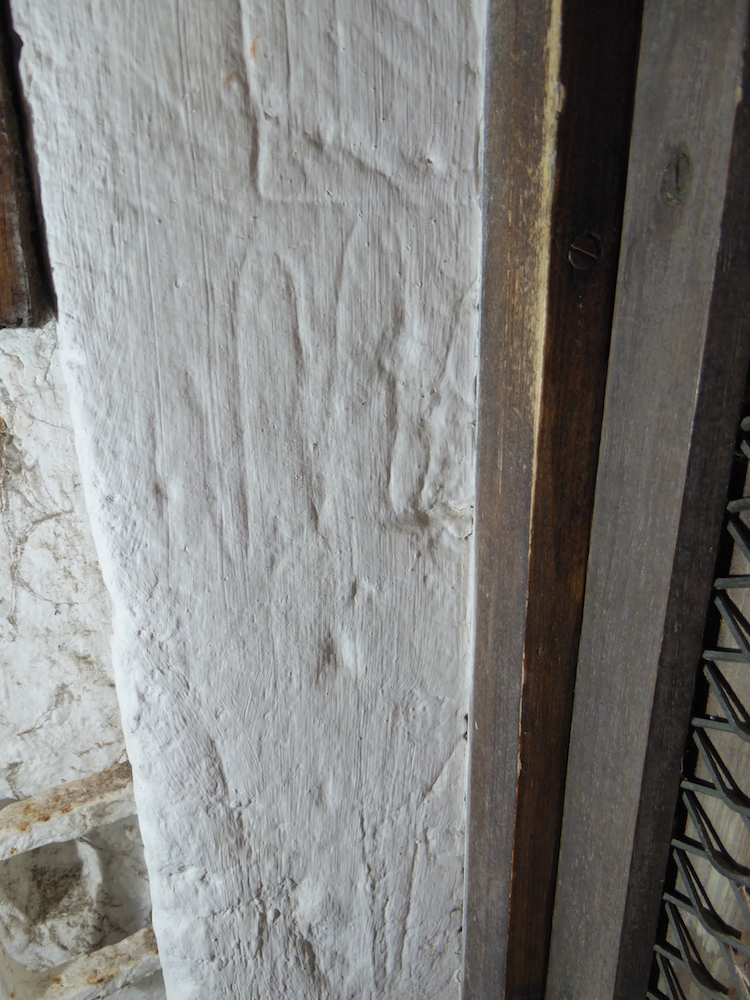 The south porch is probably 17th century. Restoration took place in the late 19th century. Some interesting graffiti was found here, mostly around the south doorway. Striking is a large hand outline on the east side of this doorway, with another possible hand outline beneath, filled with a mesh pattern. The hand is well known to the church and was the source of inspiration for the design of a modern stained glass window opposite in the north wall. There are also names, initials and dates (some relatively recent), crosses, and some possible ritual protection or apotropaic marks in the form of double Vs and a “butterfly” shape.