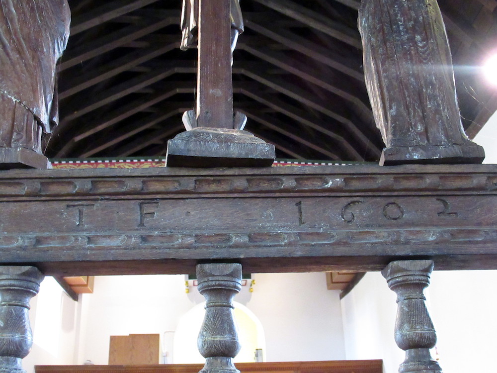 The wooden screen bears the initials TF and date 1602 and is thought to come from North Stoneham church, thus linking the initials to Thomas Fleming. The pulpit seems contemporary and bears the well carved initials I M.