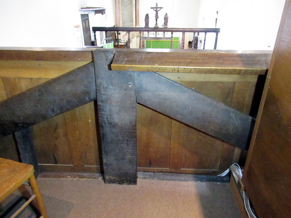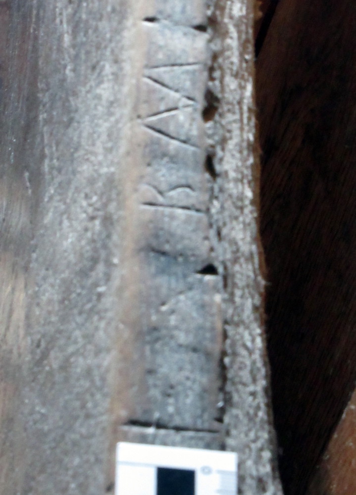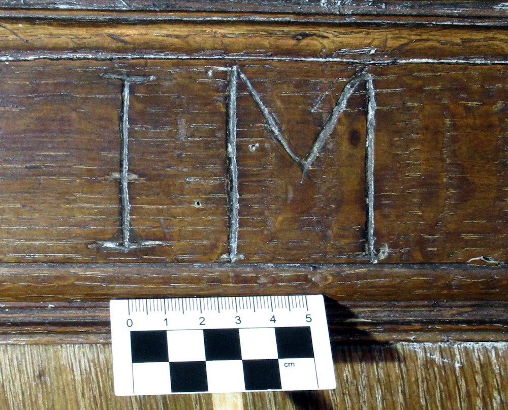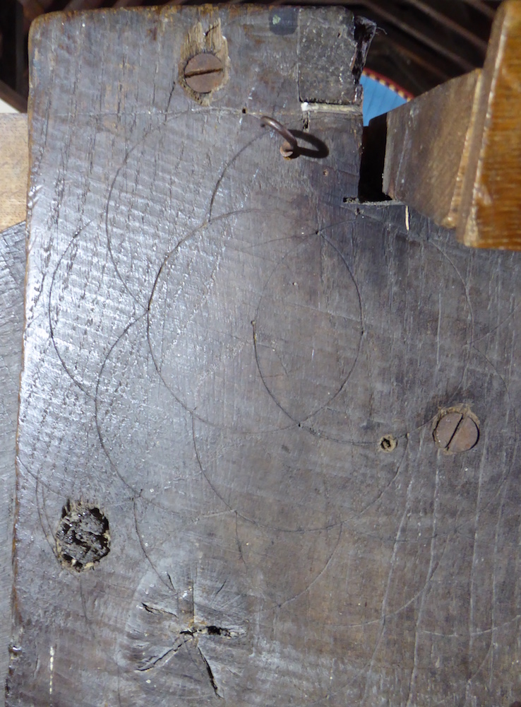 The gallery was apparently built in 1822 but contains earlier timbers. The top of the supporting king post has an impressive group of 23 overlapping compass-drawn circles at the top, which could be apotropaic in function. Along the top of the south angled brace joining it are a number of incised letters, including many Ms and Ws which may well be protective also.