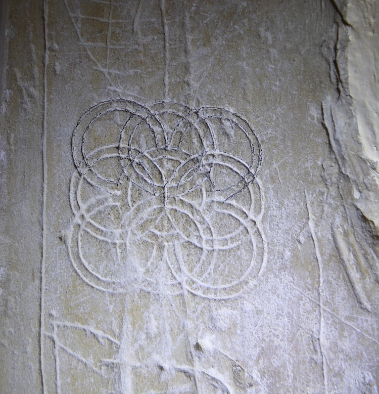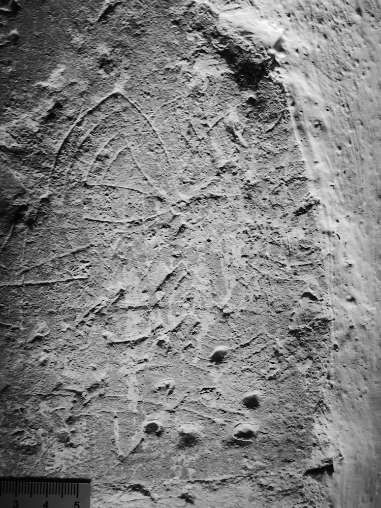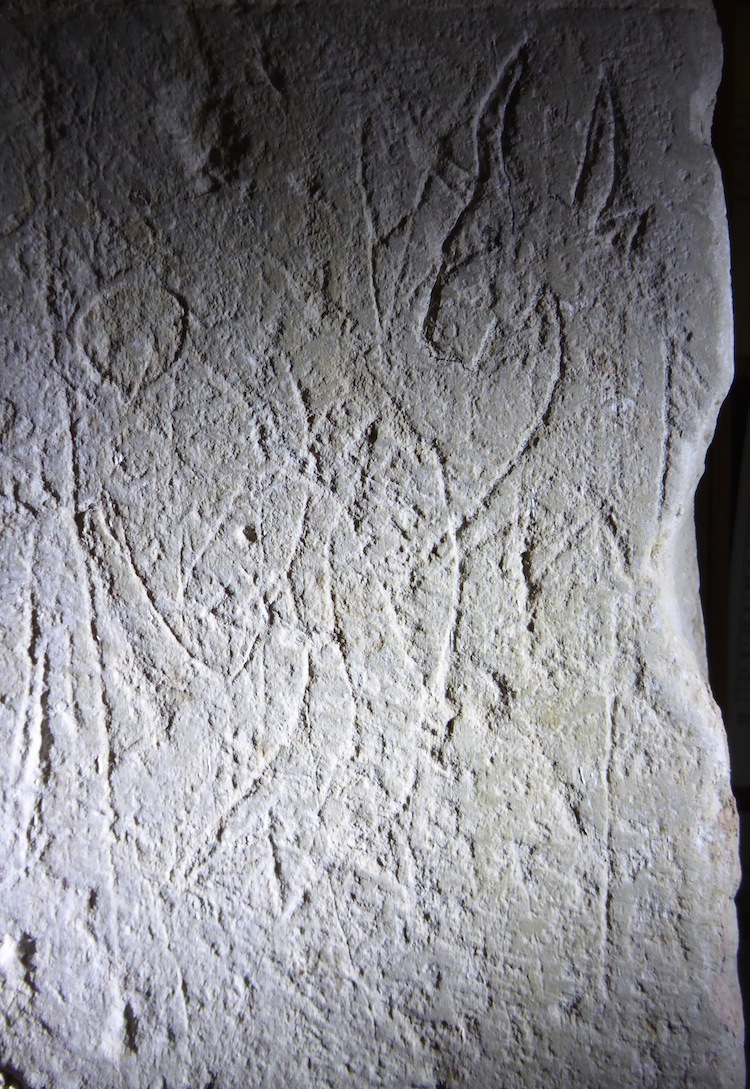 All Saints, DummerThe church, first mentioned 1198 and with probable Norman masonry, has a simple nave and chancel with a west porch and bell turret. The c1200 chancel arch has a squint on the s side, and a niche for the reredos of a lay altar on the n side. Rare 17th century bell ringers’ rules are painted in black on the belfry wall. A significant amount of graffiti was found in the porch, around the inner and outer doorways, and around the two porch windows. In the main body of the church there were a few crosses on the chancel arch, and in a line of crosses along a ledge on the south side of the chancel. Within the porch were a number of compass drawn circles and hexfoils, including one very elaborate pattern of interlaced double circles. There were also several VV symbols, some inverted to form an M, crosses, masons’ marks, and some possible music notation. There were also a lot of initials, some boxed, and dates. RP was particularly prolific. Most interesting was the image of a horned head on the N side of the porch doorway, which the church warden referred to as a Devil. The head has well defined horns and ears, but to the surveyors’ eyes, looks like an ox head. The head has a neck, which ends in a zig zag line, which is reminiscent of a mummer’s costume head. Next to this head is another, fainter, head, also referred to by the church warden as a devil, but looking more like a horse to the surveyors. Again, this head seems to have a neck ending in a zig zag line. Another suggestion for this image is that it depicts a crested helmet, similar to one at Anstey, Herts, illustrated in V Pritchard’s English Medieval Graffiti 1967. Further investigation of these images is recommended.Photographs, taken by members of the Medieval Graffiti Survey, are shown below. Each image is linked to a larger version; to see the larger version it may be necessary to allow 'pop-ups'. Survey took place 17 June 2017. Surveyors: Phil Howe, Lyn Hardy (church warden), Karen Parker, Karen Wardley | ||